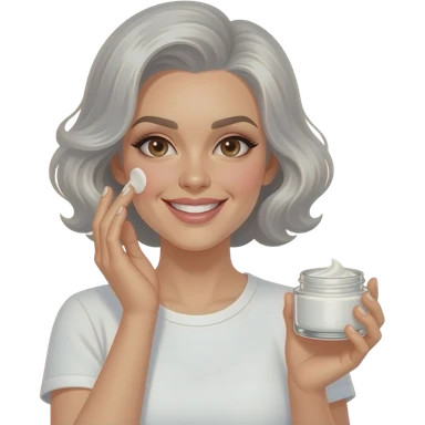 Style: 3D Memoji style, soft studio lighting, white background. Character: 60s elegant woman, wavy silver bob, brown eyes, white t-shirt. Skin: natural healthy glow, dewy interior glow. Style + Character + Skin + Action: smile, applying white cream to cheek, holding glass cream jar. emoji