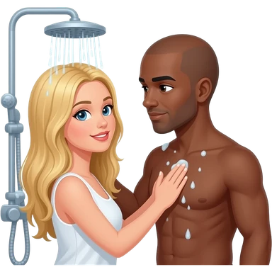 Blonde girlfriend taking a shower together with black boyfriend with bald head emoji