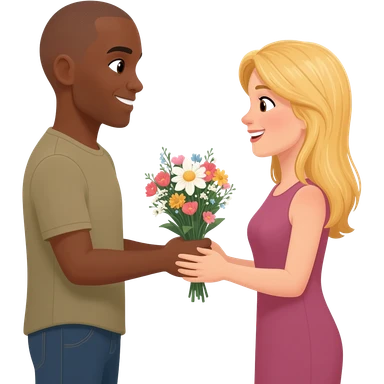 Black man with shaved head giving flowers to blonde woman emoji