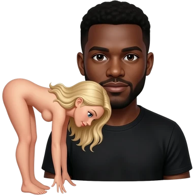 Nude bald Black man squeezing naked Blonde woman downward dogg emoji