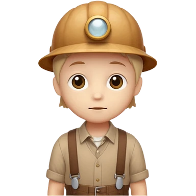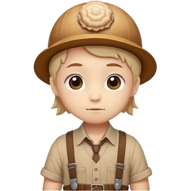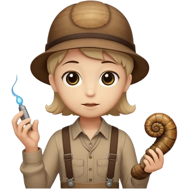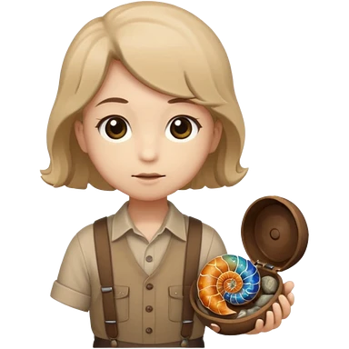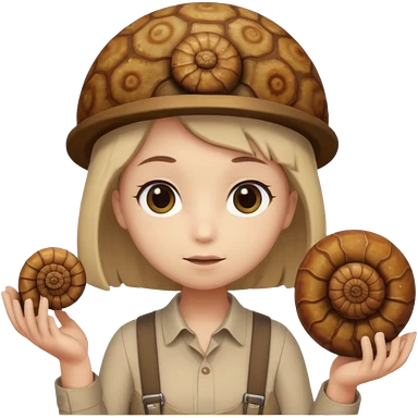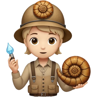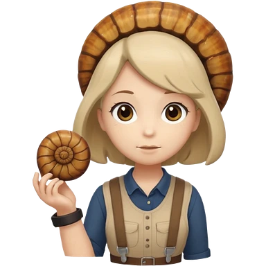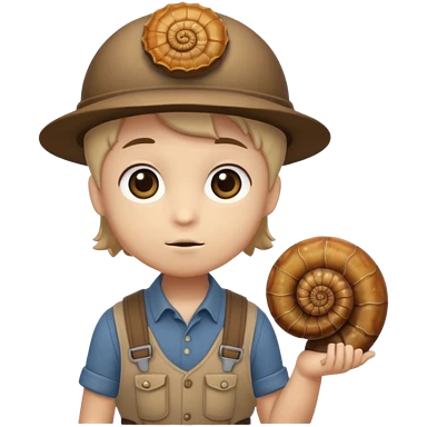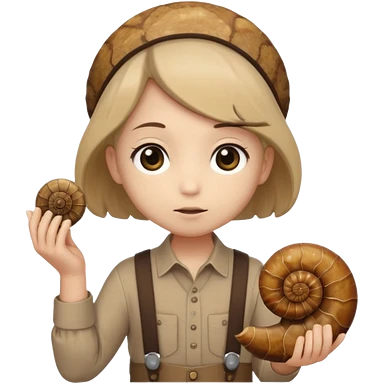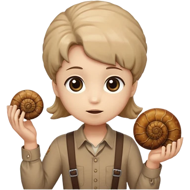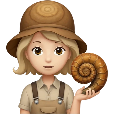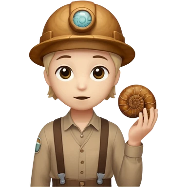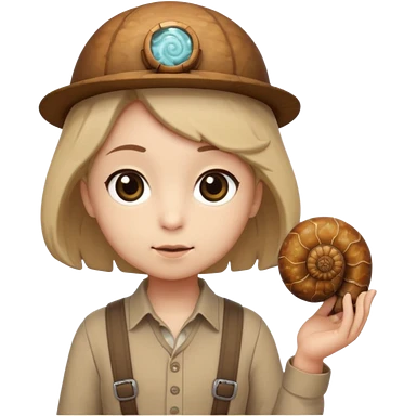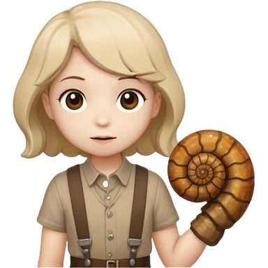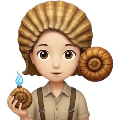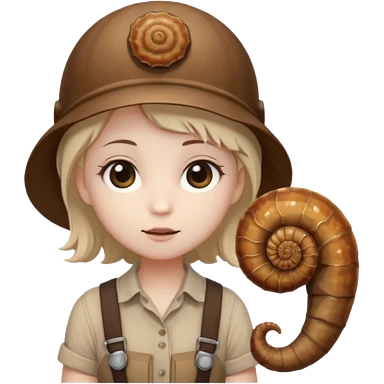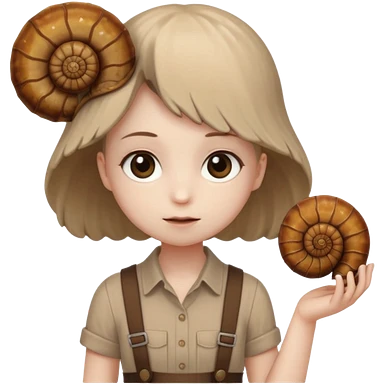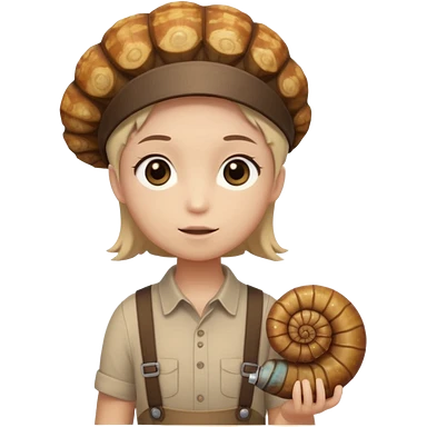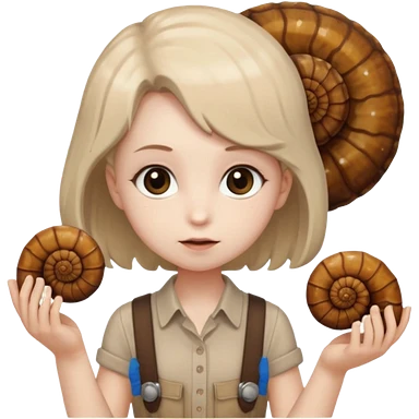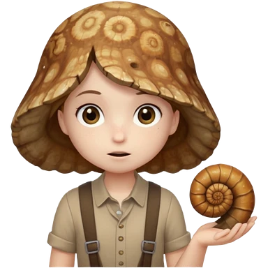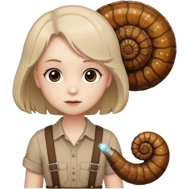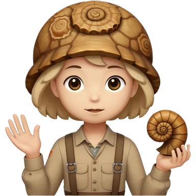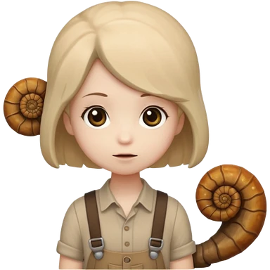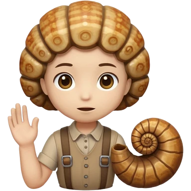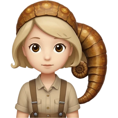 Shelly has a small, chibi-style body with a large ammonite-shaped head that looks like a beige fossil shell. One side of her head has a dark opening, making it clear she isn’t human. Her face is simple and soft, with big round eyes. She wears a brown suspender outfit over a lighter shirt emoji