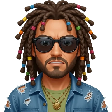 he's a cool pickle hippy from california with wearing sunglasses and the look of a warrior on his face, a bit tattered and with darker dreads excluding colored bands and with nappy dreads emoji