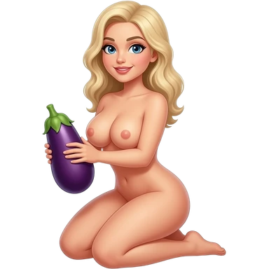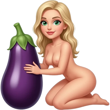 Naked woman tits out long blonde hair green eyes full body no clothing kneeling eggplant in hand emoji