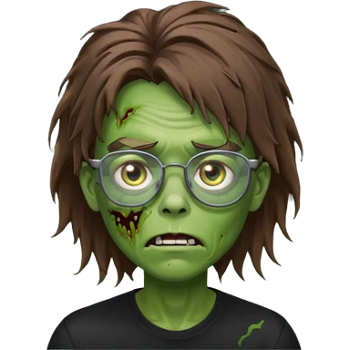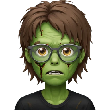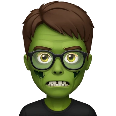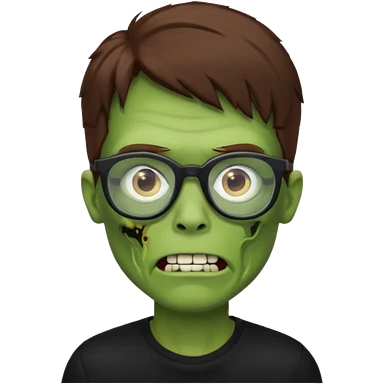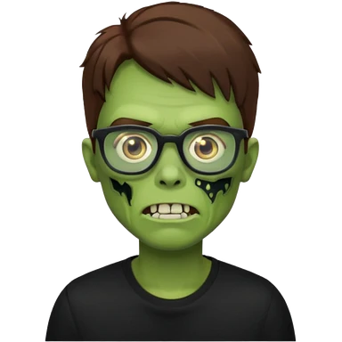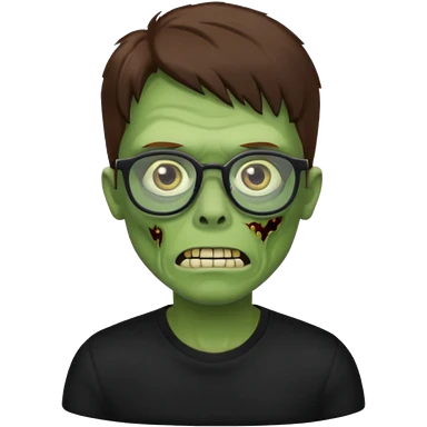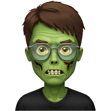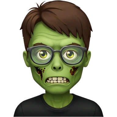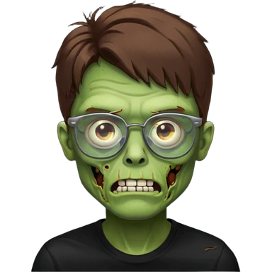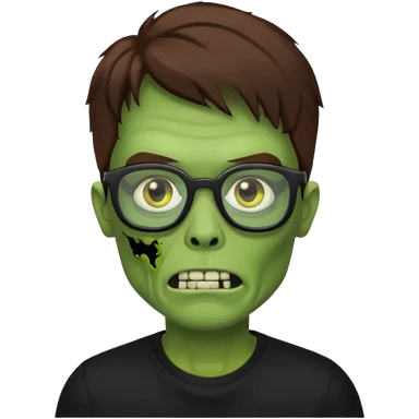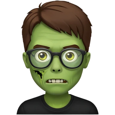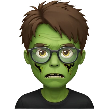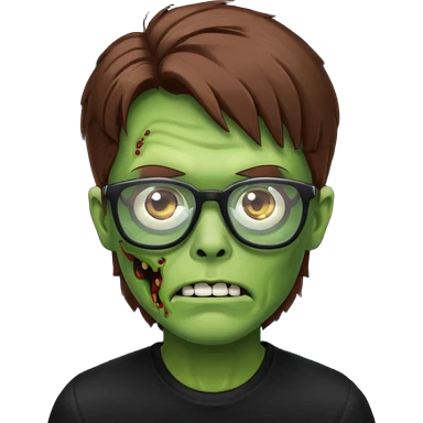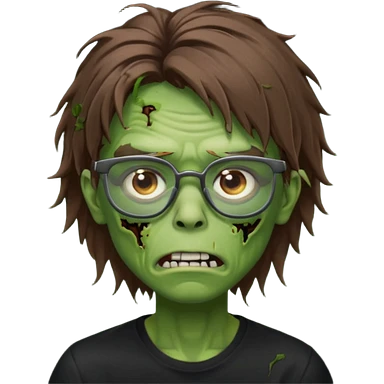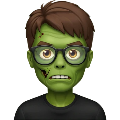 Green zombie, brown messy hair covering the forehead, black glasses, black shirt. iOS style. emoji
