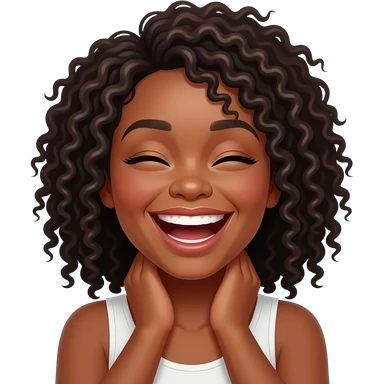 Black woman with hands crossed holding on to their neck gently and laughing hard with eyes closed and long hair emoji