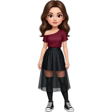 a girl with brown hair and brown eyes, wearing make-up in a flowing black skirt and a burgundy t-shirt that falls over one shoulder and socks over knee-high black sneakers poses emoji