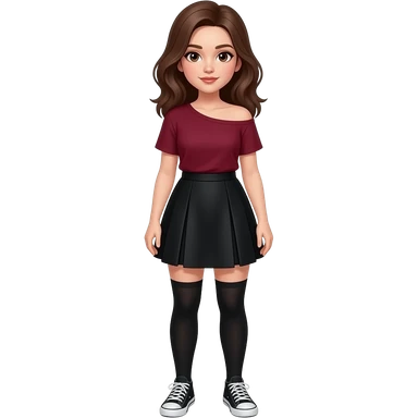 a girl with brown hair and brown eyes, wearing make-up in a flowing black skirt and a burgundy t-shirt that falls over one shoulder and socks over knee-high white and black sneakers poses emoji