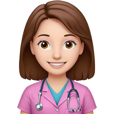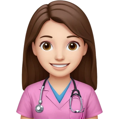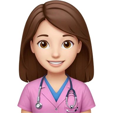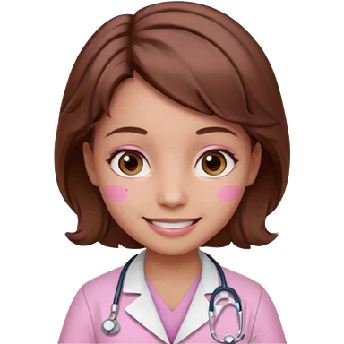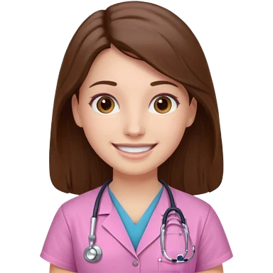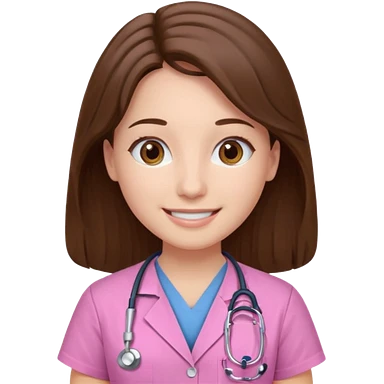 doctor, pink, she, hair brown, eyes brown, scrub baby pink, white skin, long hair, smile emoji