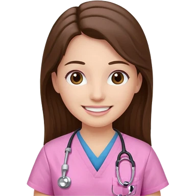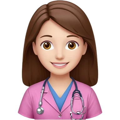 doctor, pink, she, hair brown, eyes black, scrub pink, white skin, longlong hair, smile emoji