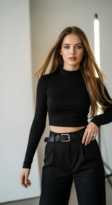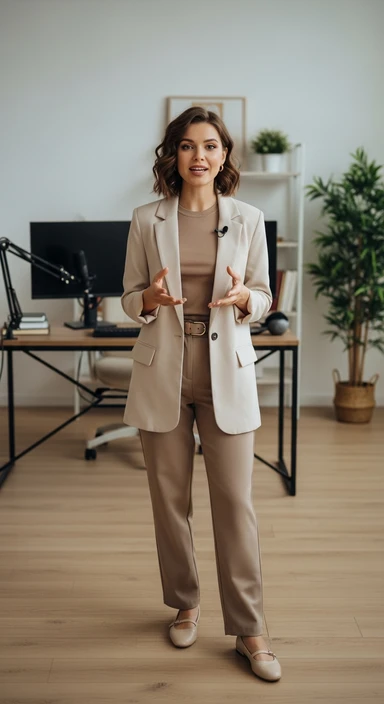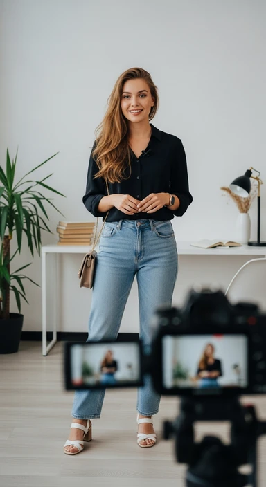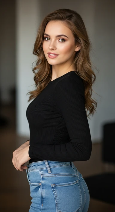я создаю ИИ блогера, сгенерируй очень красивую девушку в полный рост (должно быть видео ее лицо и тело) на вид ей должно быть лет 19 emoji