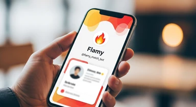 у меня в телеграм бот для знакомств - Flamy. Логотип бота - Emoji огонька. id бота в телегам - @flamy_match_bot. Мне нужно чтобы ты сгенерировал картинку для рекламного поста, чтобы рекламировать бота в других каналах. Сделай рекламу где показано как держат телефон на котором открыт Flamy. emoji