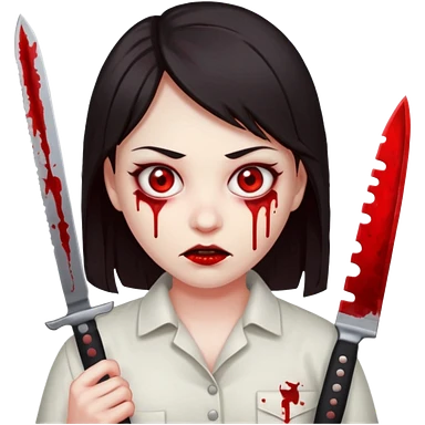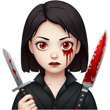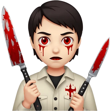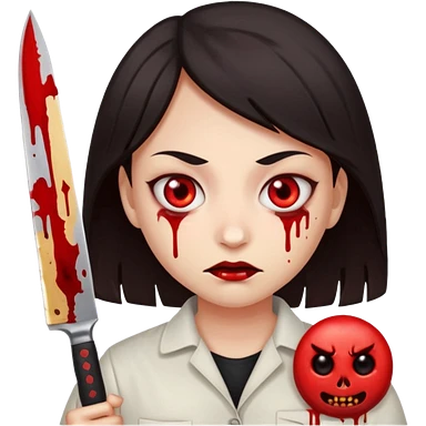 RED EYES, EVIL EMOJI, KILLER EYES, DARK HAIR, BLOODY EYES, KNIFE IS IN THE HAND emoji