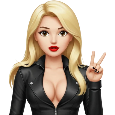 a hott good looking blonde with large breasts, red lips, and long blonde hair with leather sexy outfit and leather high heel boots and she is giving the middle finger emoji