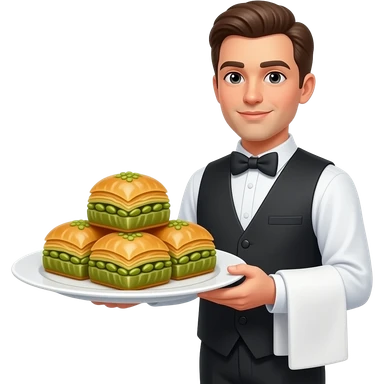 Beyaz sunum tabağına 4 tane fıstıklı baklava koy ama gerçekçi olsun ve garson getirsin sunum yapsın emoji
