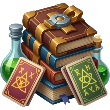 🛡️ An ancient-style pile of books and cards and potions, bound in dark wood, with glowing rune pages. emoji