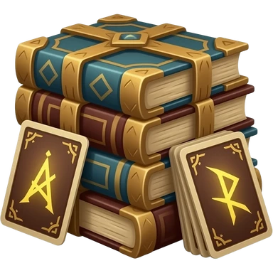 🛡️ An ancient-style pile of books and cards, bound in dark wood, with glowing rune pages. emoji