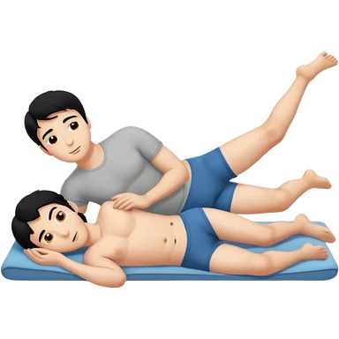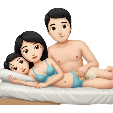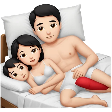 Мужчина и женщина спять в одной кровати, муж - черные волосы, в трусах лежит прямо на спину. На правой руке лежит голая девушка.на левый в бок, на правой руке мужа. Жена поставила правую ногу на живот мужа. emoji