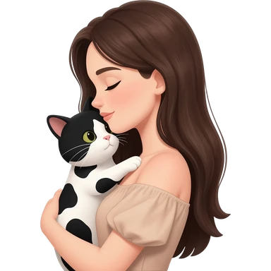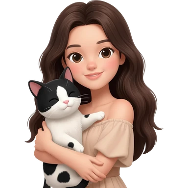 A young woman with long dark brown hair, wearing a nude off-shoulder top, hugging a black and white cow-patterned cat, 3D emoji style, white background,Turn to face forward. emoji