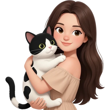 A young woman with long dark brown hair, wearing a nude off-shoulder top, hugging a black and white cow-patterned cat, 3D emoji ios style, white background,Turn to face forward. emoji