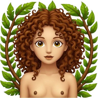 Psychedelic naked goddess of the forest with brown eyes , brown curly hair, whole figure emoji