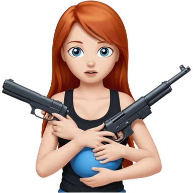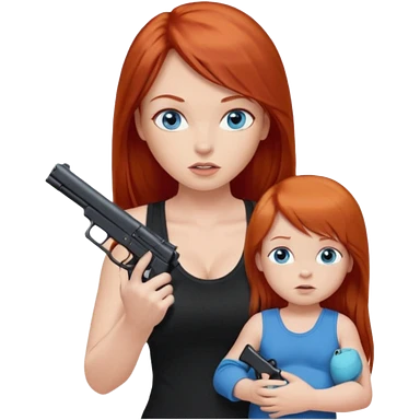 A red head with long straight hair, she has blue eyes with big boobs. She’s wearing a black tank top and holding a gun up in one hand and a baby boy with blue eyes sucking on one of her boobs in the other arm emoji