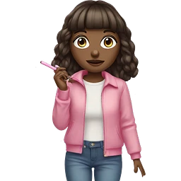 Brunette blue eyed girl with bangs pink outfit with a cbd blunt emoji