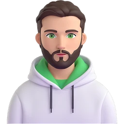 man with short full beard, dark brown undercut hairstyle, white hoodie, and green eyes emoji