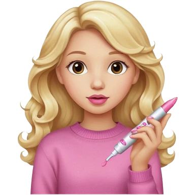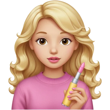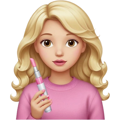 A long curled blonde haired girl with a pink sweater and holding a lip gloss emoji