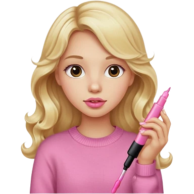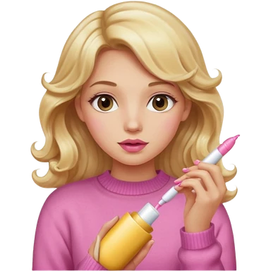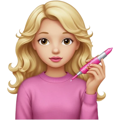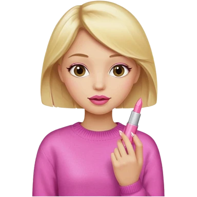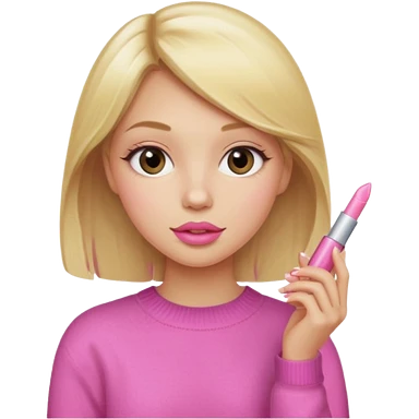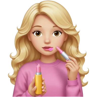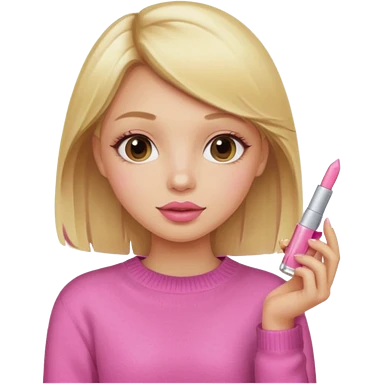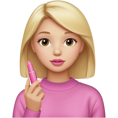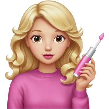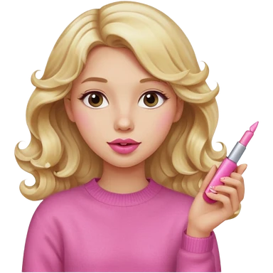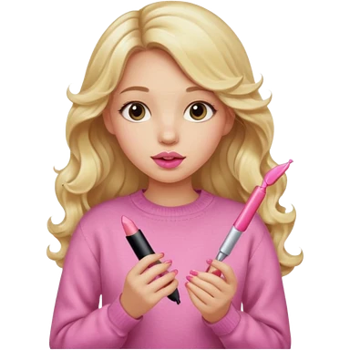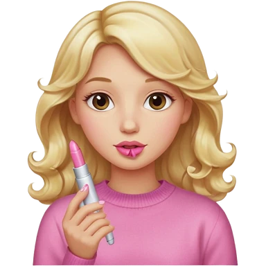 A blonde haired girl with a pink sweater and holding a lip gloss emoji