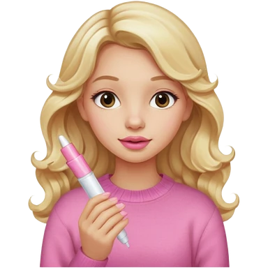 A long curled blonde haired young girl with a pink sweater and holding a lip gloss emoji