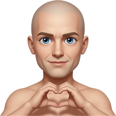 Homme sans cheveux, yeux bleus qui fait le signe coeur emoji
