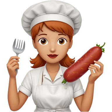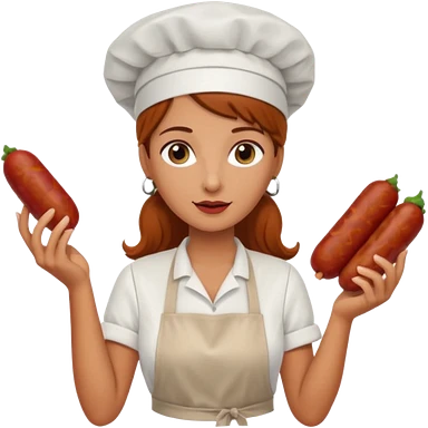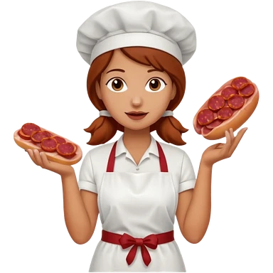 Charcuteraa con un chorizo y embutido en la mano con una redecilla en el pelo y delantal blanco emoji