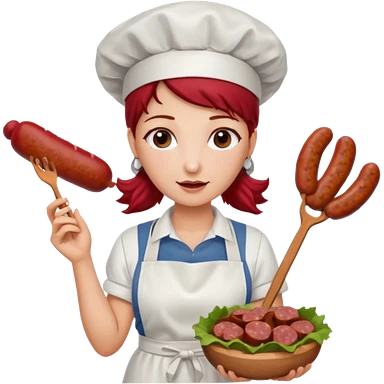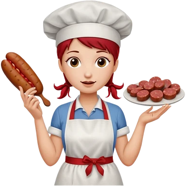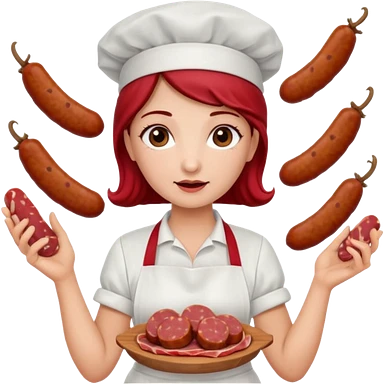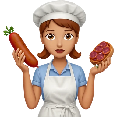 Charcutera con un chorizo y embutido en la mano con una redecilla en el pelo y delantal blanco y añade mucha carne alrededor emoji