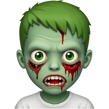 Faça um menino zumbi com a boca meio torta com machucado fo lado da boca camisa branca emoji