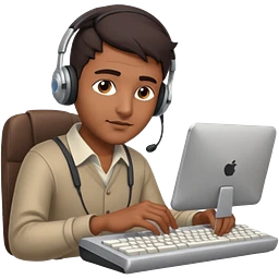 Indian man with headset, typing on a keyboard, subtle sly look emoji