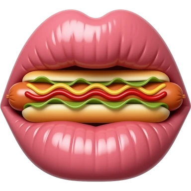 sheep plush on its knees sucking hard on a hotdog in its mouth with big puffy filler lips, tongue wrapping around the hotdog emoji