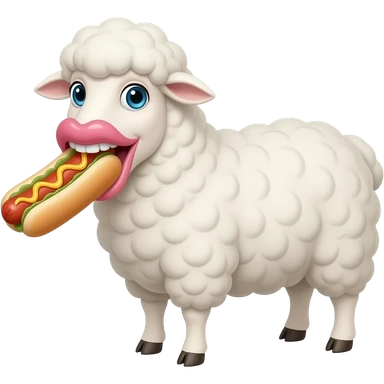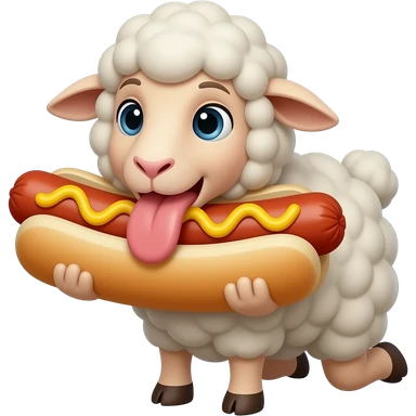 sheep plush on its knees eating a hotdog in its mouth with covered in lots of sticky mayo emoji