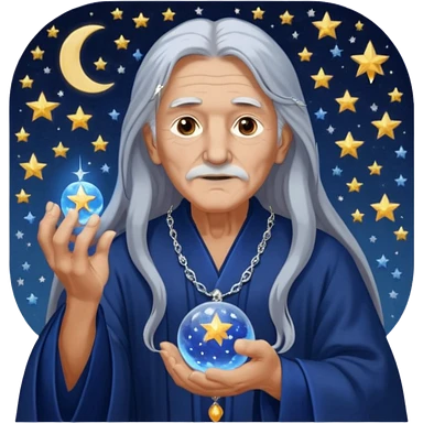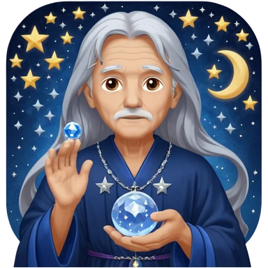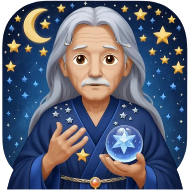 The Dream Interpreter will be depicted as an elderly figure with long, silver hair and a piercing gaze. He will be dressed in a long, dark blue robe, decorated with embroidered stars and moons. 🌟 He will hold a crystal ball 🔮 in his hand, in which hazy images of dreams can be seen emoji