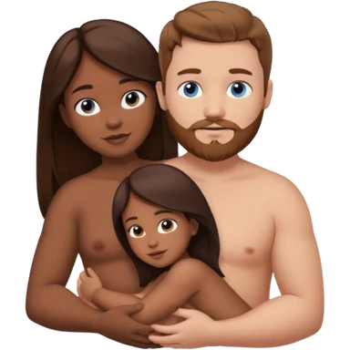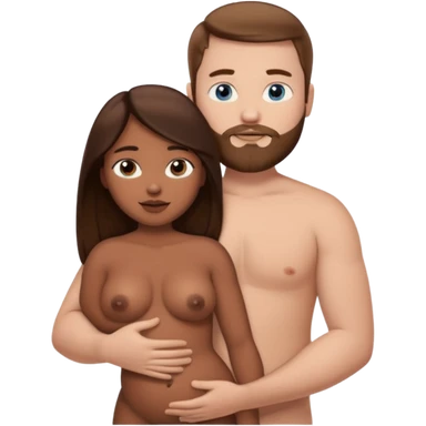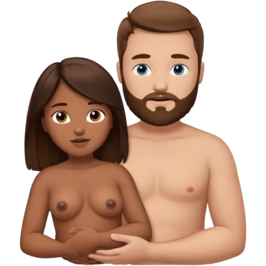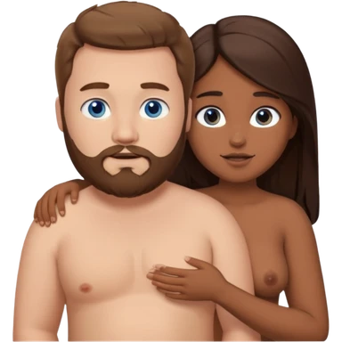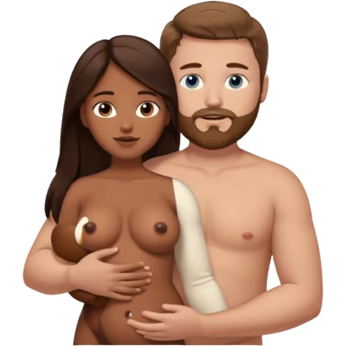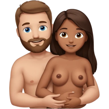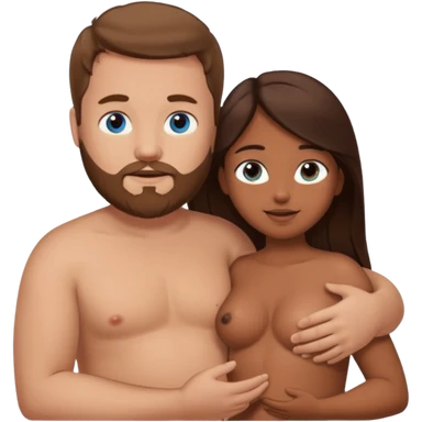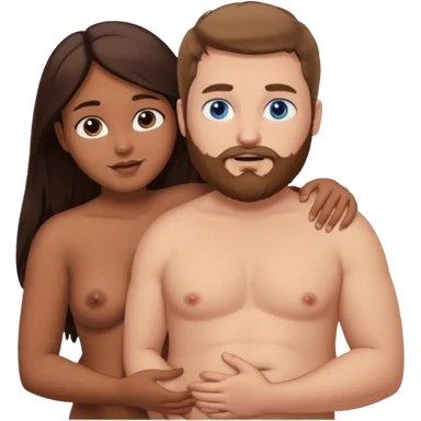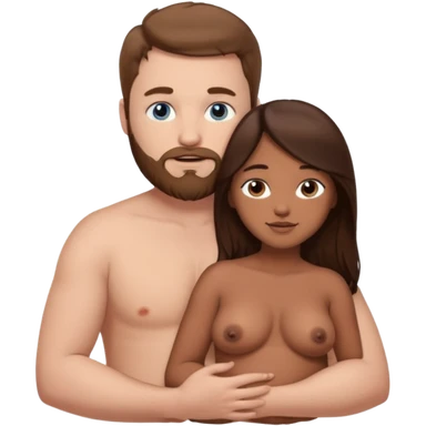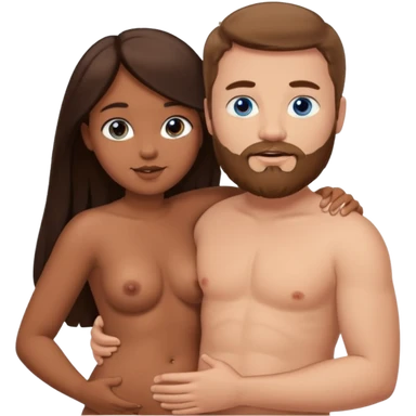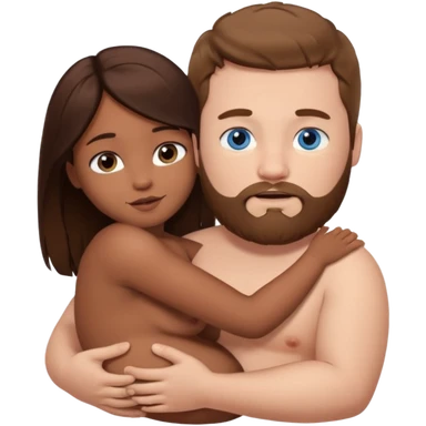 chubby white guy with brown hair and beard and blue eyes, holding a brown girl with long dark hair and dark brown eyes in arms, naked, showing tits and pussy emoji