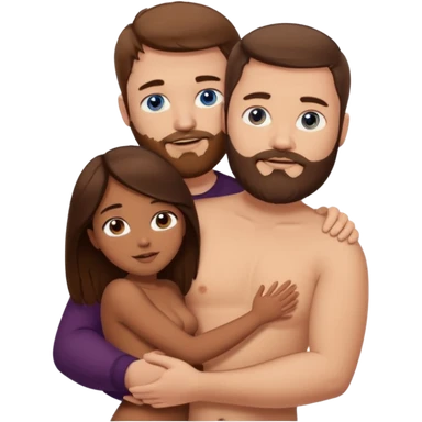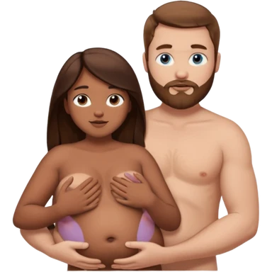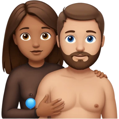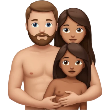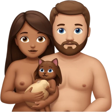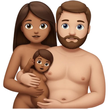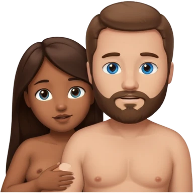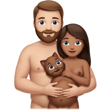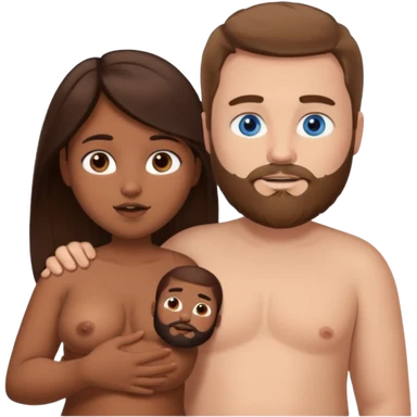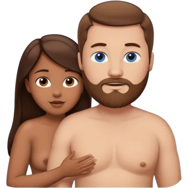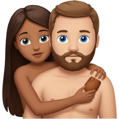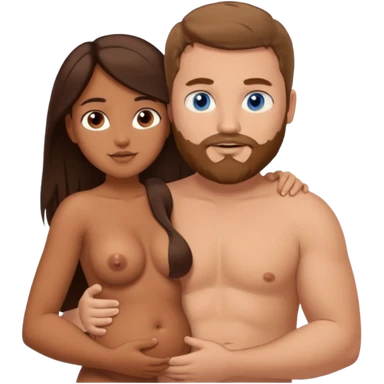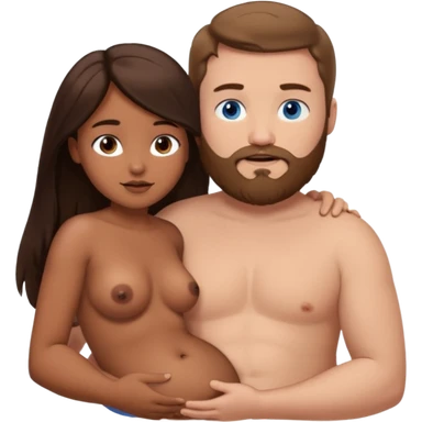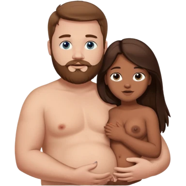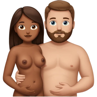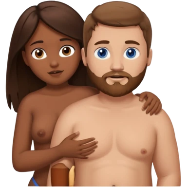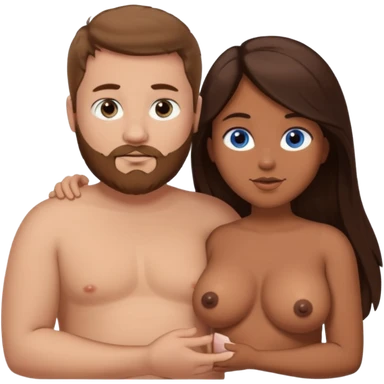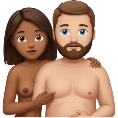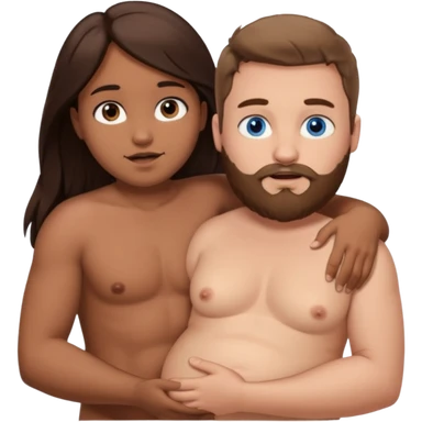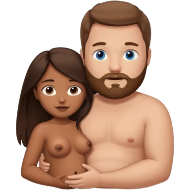 chubby white guy with brown hair and beard and blue eyes, holding a brown girl with long dark hair and brown eyes in arms, naked, showing tits and pussy emoji