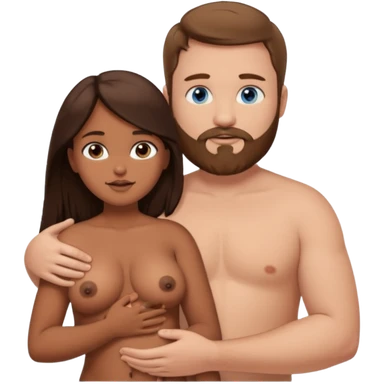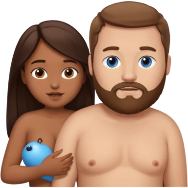chubby white guy with brown hair and beard and blue eyes, holding a brown girl with long dark hair and dark brown eyes in arms, naked, showing tits emoji