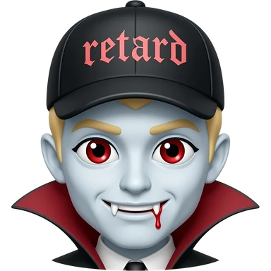 Make an vampire with cap on his head and text on cap “retard” vampire has blond hair and white skin blood eya and wolf cut make it like iphone emojji emoji