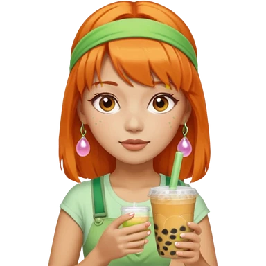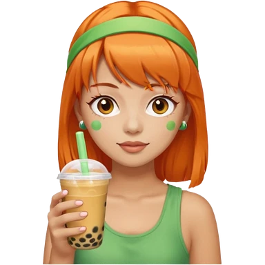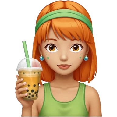 Create an emoji of a woman with orange hair, bangs, and a green headband, holding a cup of bubble tea. emoji