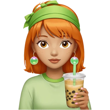 Create an emoji of a fair-skinned woman with long orange hair, bangs, and a green headband, holding a cup of bubble tea. emoji