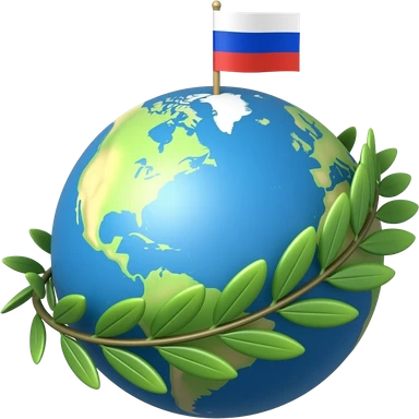 A blue globe of the Earth with a green olive branch wrapped around it. A small Russian flag is planted on top of the globe. Simple flat vector art, round emoji format, soft green and blue colors, white background, peaceful, clean lines. emoji