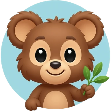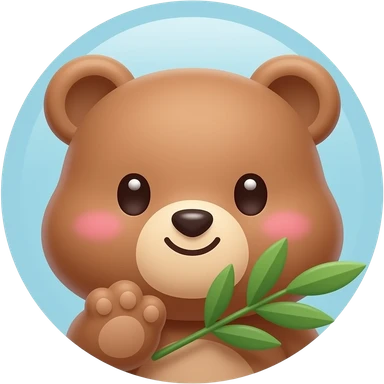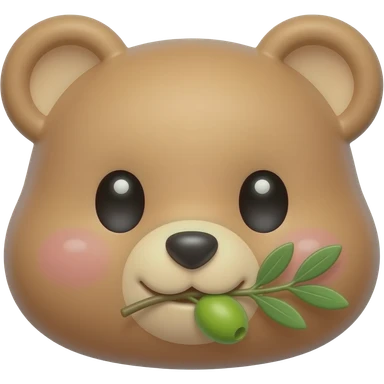 A cute kawaii cartoon bear face, chubby cheeks, big shiny eyes, small smile, holding a green olive branch in its mouth or paw, background is soft light blue or white, round emoji style, simple vector art, bright pastel colors, adorable, no shadows, flat design emoji