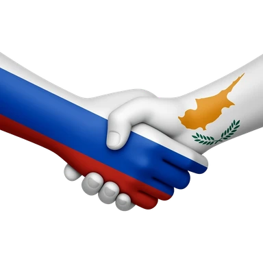 Две руки пожимают друг друга, одна рука в цветах российского флага (белый, синий, красный), другая в цветах флага Кипра, квадратное изображение, стиль эмодзи, яркие цвета» emoji