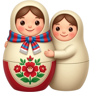 Two nesting dolls (matryoshkas) hugging each other. One has a Russian scarf with traditional red floral pattern, the other has a neutral simple dress. Both are smiling warmly. Simple flat vector, round emoji style, bright pastel colors, friendly, no shadows. emoji