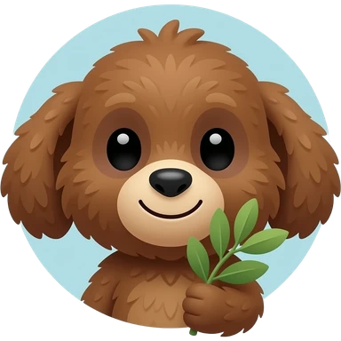 A cute kawaii Cheburashka face, big round floppy ears, large innocent black eyes, small snub nose, soft brown fluffy fur, holding a small green olive branch in its paw, sweet gentle smile, round emoji style, pastel light blue background, simple vector art, adorable, flat design, very cute emoji