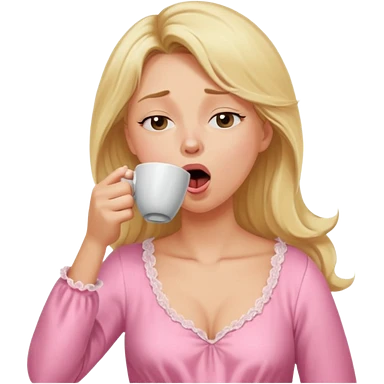 A blonde woman in a pink nightgown yawns, looking sleepy with dark circles under her eyes, drinking coffee, looking like she just woke up. emoji